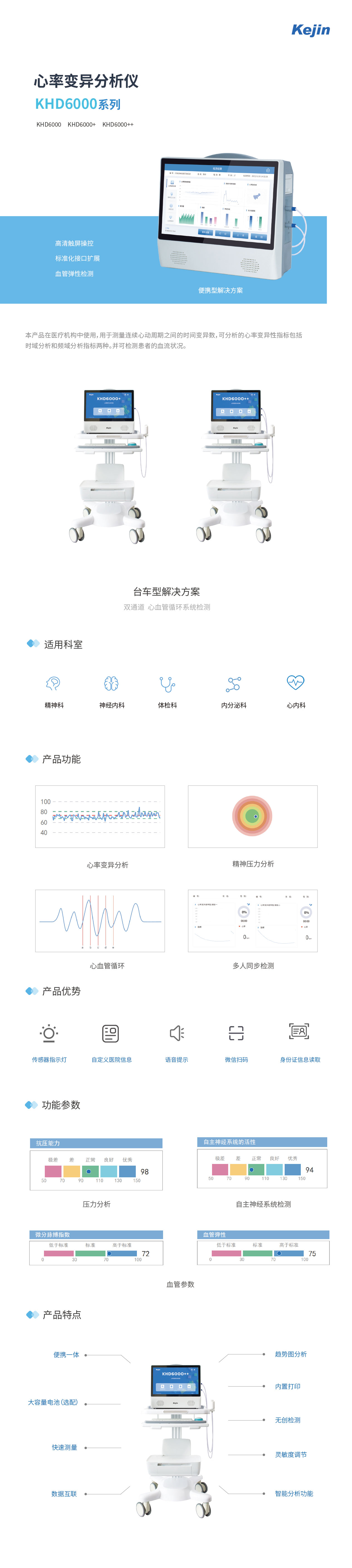 本產品在醫(yī)療機構中使用,用于測量連續(xù)心動周期之間的時間變異數,可分析的心率變異性指標包括時域分析和頻域分析指標兩種。并可檢測患者的血流狀況。