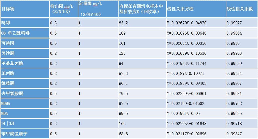 考察方法檢出限、定量限,污水中基質效應,標曲線性相關系數