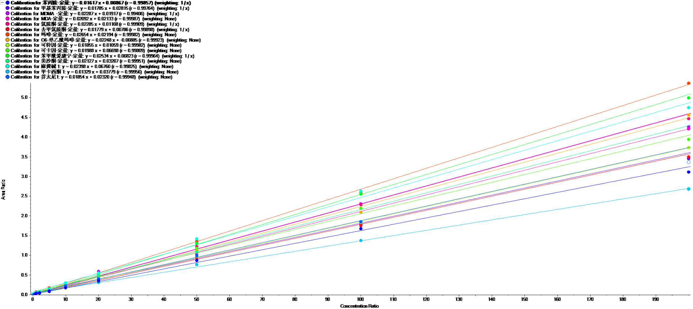 15種毒品線性關系圖,線性范圍從1ng/L-200ng/L,線性關系均大于0.998