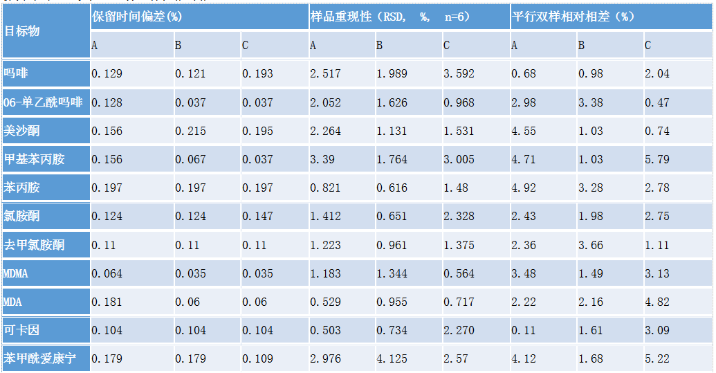 考察實際樣品中每種毒品保留時間的偏差,樣品重現性,雙樣平行相對相差